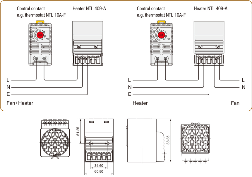Il termoventilatore previene la formazione di condensa e garantisce una temperatura dell'aria interna distribuita uniformemente negli armadi con componenti elettrici/elettronici. Il riscaldatore viene collegato utilizzando i connettori terminali interni. Le dimensioni ridotte dell'NTL 409-A lo rendono ideale per l'uso in involucri dove lo spazio è limitato.